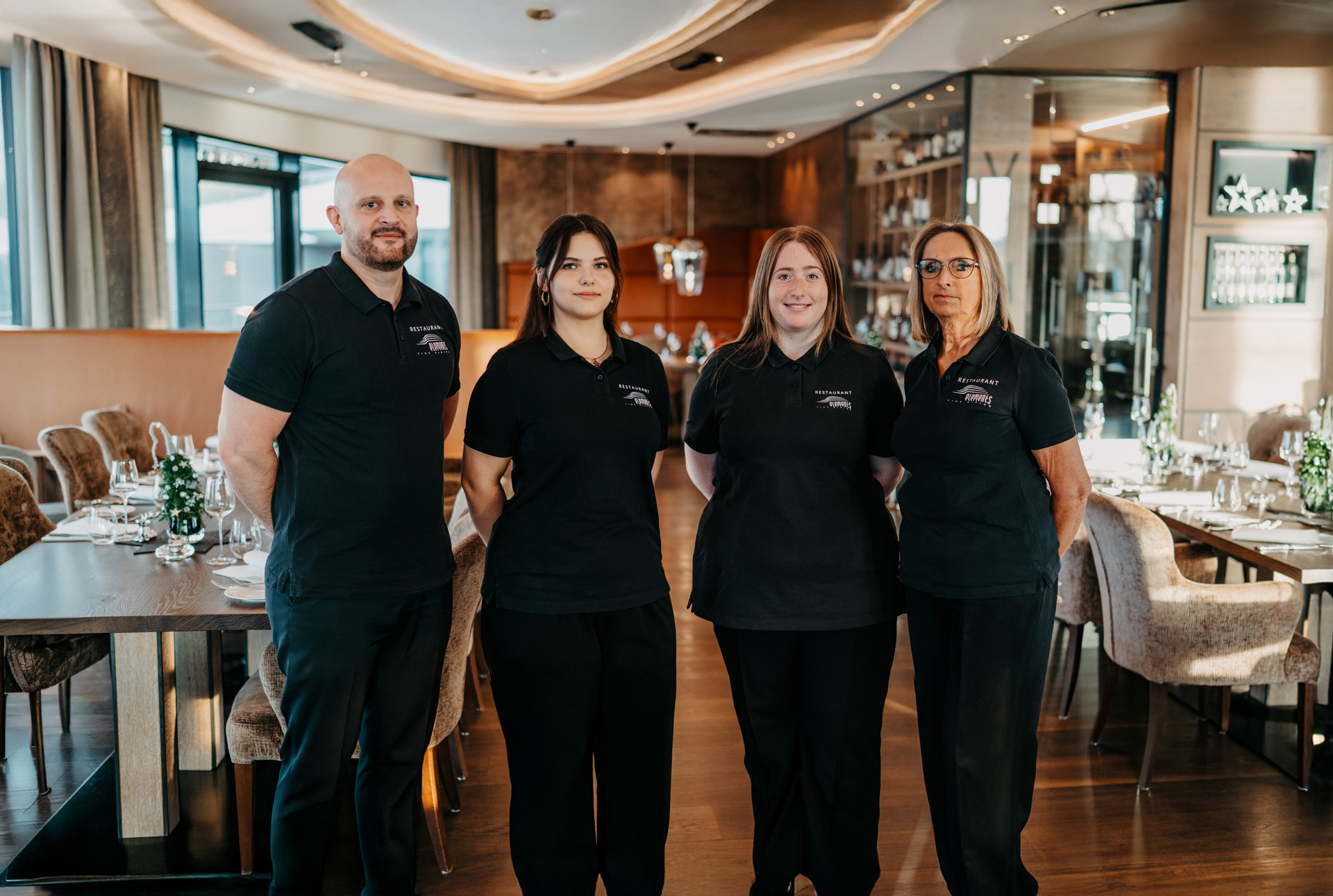 Das Serviceteam wird von Bernd Richter (l.) und Maria Krauss (r.) geführt – unterstützt von den Auszubildenden Selina Bauer (2. v. l.) und Marie Dostler (2. v. r.).